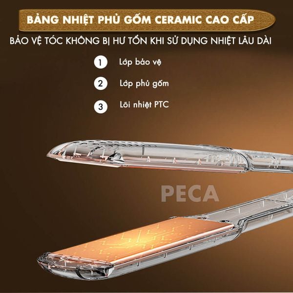 Lớp phủ gốm Ceramic cao cấp: Cấu tạo 3 lớp giúp phân bố nhiệt đều, giảm ma sát tối đa. Nhờ đó, tóc sau khi duỗi vẫn giữ được độ bóng mượt, hạn chế tình trạng khô xơ, hư tổn khi dùng nhiệt lâu dài.