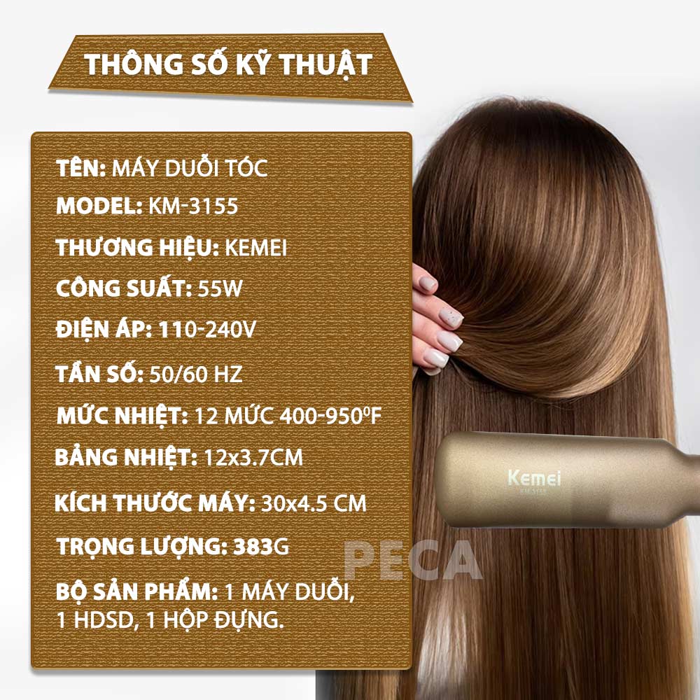 | Bộ sản phẩm bao gồm | 1x Máy duỗi tóc KM, 1x sách hướng dẫn sử dụng, 1x hộp đựng |