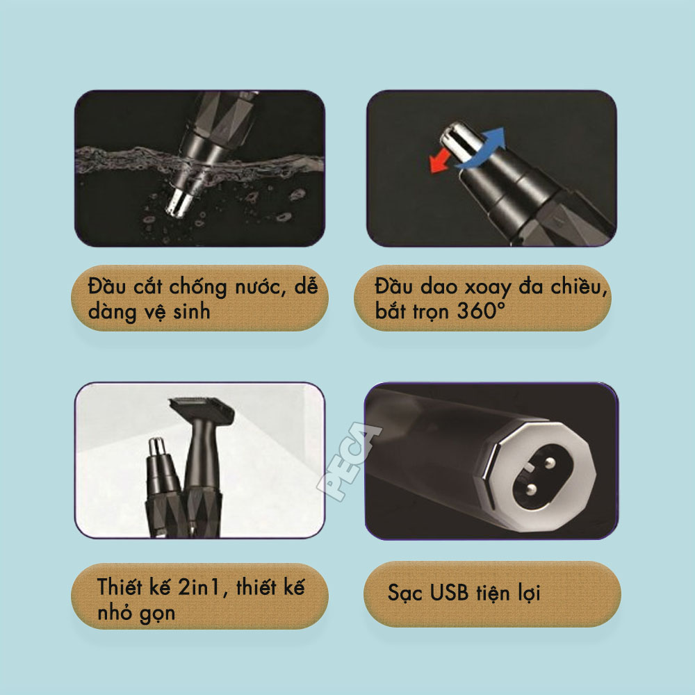 Đầu Tỉa Lông Mũi/Tai: Thiết kế đầu cắt tròn với lồng bảo vệ bằng thép không gỉ, giúp thu gọn lông mũi và lông tai an toàn tuyệt đối. Cơ chế xoay 360 độ cắt đứt lông nhanh chóng mà không gây kẹt, giật hay tổn thương vùng da nhạy cảm bên trong.