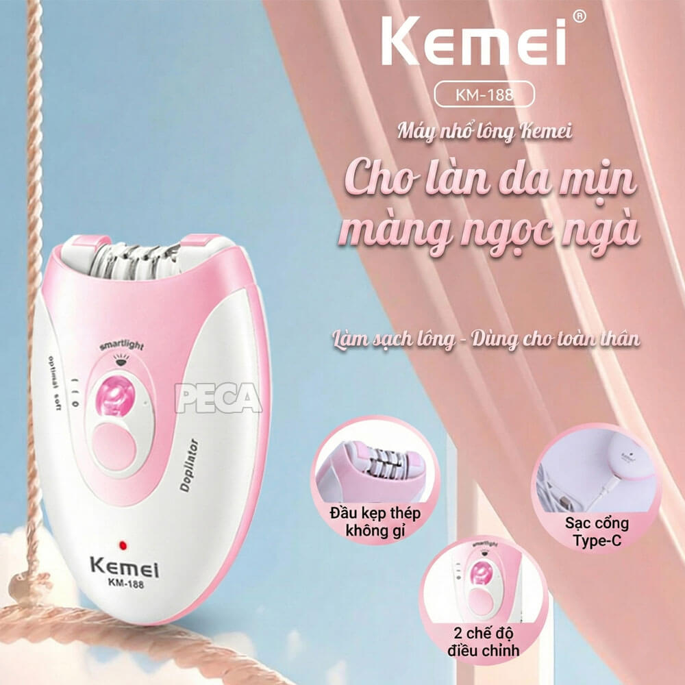 Hãy để Máy Nhổ Lông Điện Tử Chuyên Nghiệp Kemei KM-188 trở thành giải pháp đột phá cho bạn. KM-188 sử dụng công nghệ nhổ tận gốc, mang lại làn da mịn màng lâu dài. Với thiết kế nhỏ gọn, màu sắc nữ tính và tích hợp nhiều tính năng thông minh, việc loại bỏ lông không mong muốn giờ đây trở nên dễ dàng, hiệu quả và thoải mái hơn bao giờ hết.