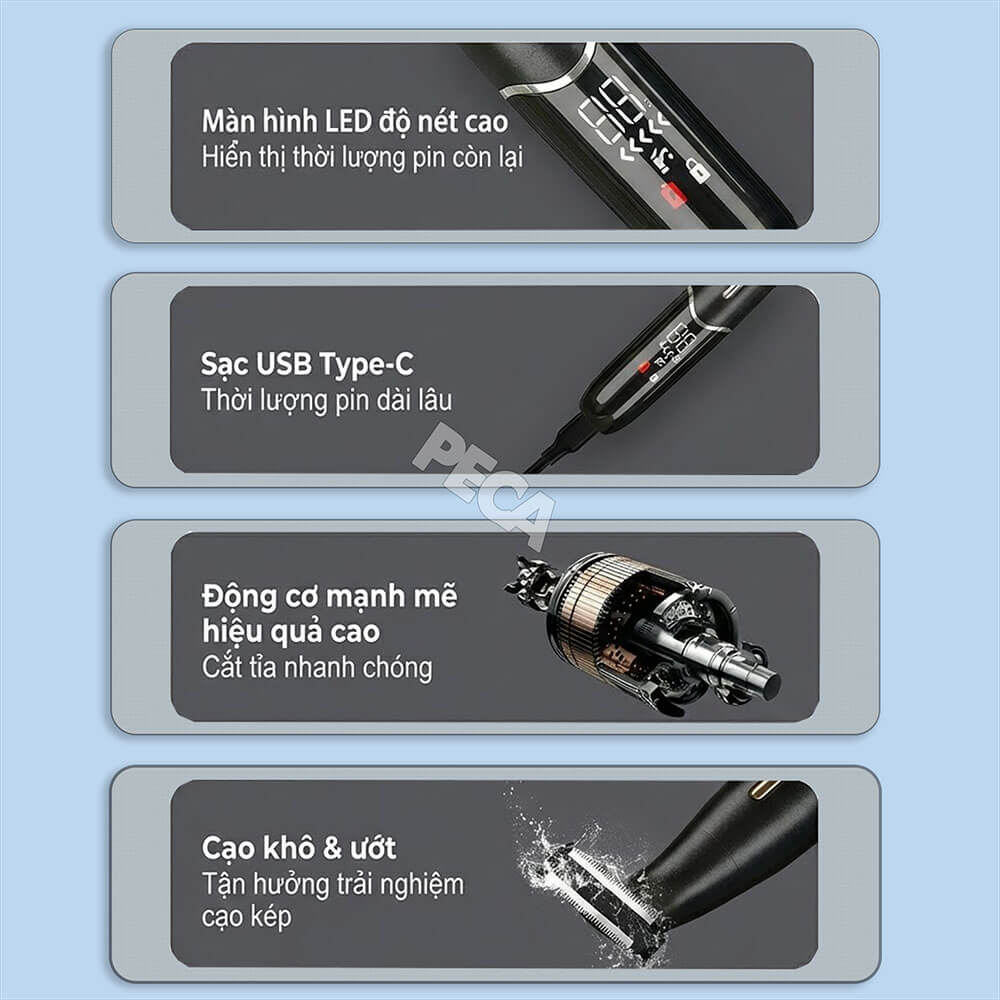 - An toàn cho da: Đặc biệt phù hợp cho việc tỉa lông mặt và lông toàn thân, kể cả các vùng da mỏng manh, nhạy cảm. Lưỡi dao được bọc lớp bảo vệ, giúp cạo sát nhưng không chạm trực tiếp vào da.