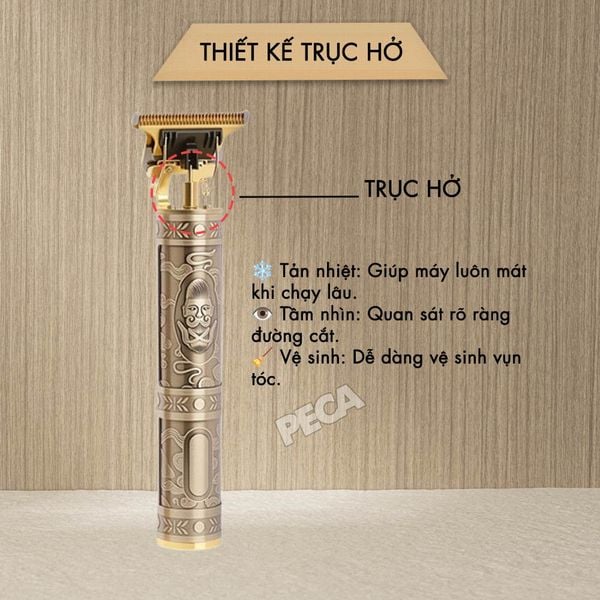 Thiết Kế Trục Hở: Phần trục lưỡi cắt được thiết kế lộ thiên giúp tản nhiệt nhanh chóng, đồng thời giúp người thợ dễ dàng quan sát đường cắt và vệ sinh vụn tóc kẹt bên trong.