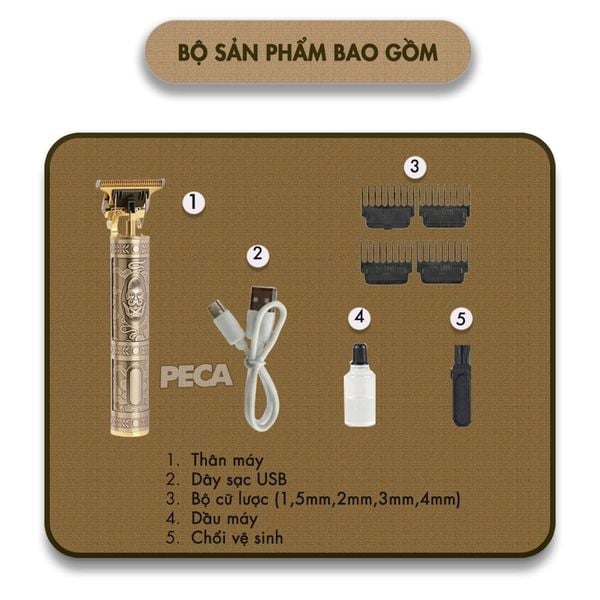 | Bộ sản phẩm bao gồm | 1x thân máy, 4x cữ lược căn độ dài: 1.5mm, 2mm, 3mm, 4mm, 1x cáp sạc USB, 1x chổi vệ sinh, 1x dầu máy, 1x hộp đựng. |